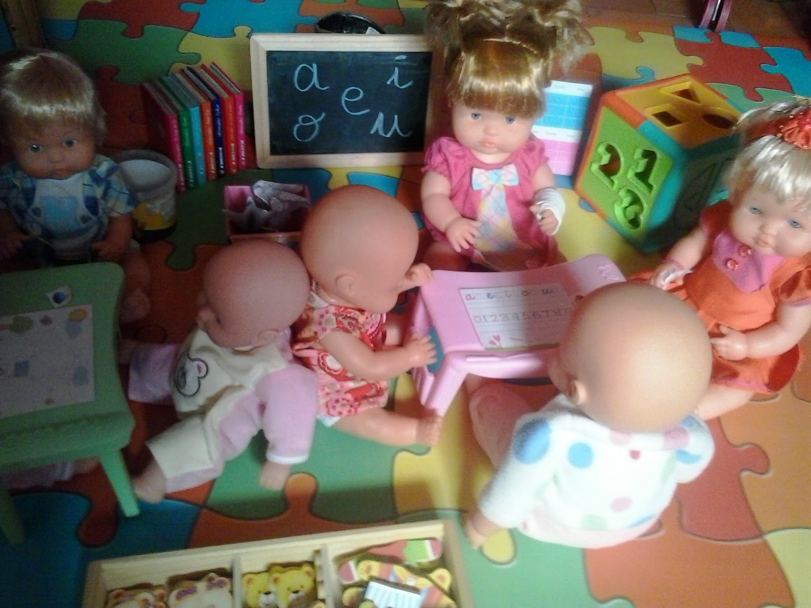 Hace tiempo, Blanca y yo montamos esta clase con sus muñecos. Pusimos algunos detalles para que pareciera el aula de un cole.